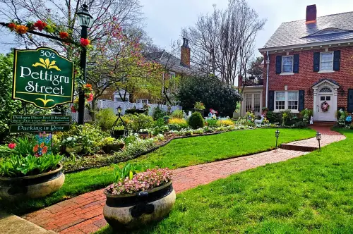 four-poster california king bed with draped sheers, hardwood floors, green queen anne chairs on each side of stand