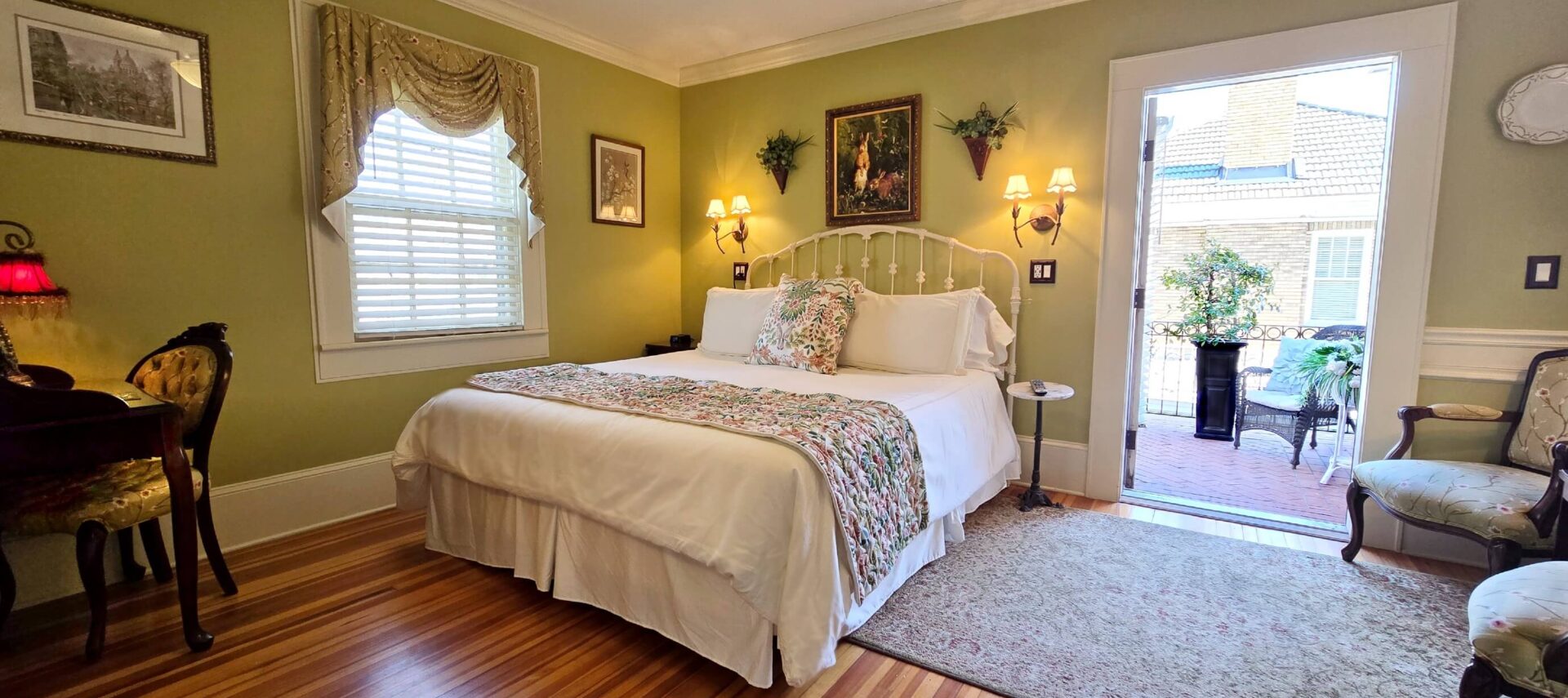 Reserve The Green Rabbit at Pettigru Place Bed & Breakfast for your visit to Greenville, SC. This guestroom has a California king bed and features soft greens and a few curious rabbits in the artwork as an homage to Greenville’s Swamp Rabbit Trail. With accommodations appointed to rival luxury hotels, this room boasts a wrought iron bed featuring all new custom-made bedding and the room itself includes a sitting area with 2 comfy chairs, a desk, and a flat-screen television. The luxurious, fully renovated bathroom features a custom-tiled shower and a separate large air tub (sixty-two holes that release gentle bubbles). The Green Rabbit also features a large private porch with a large sofa and chair – just the place for your morning coffee or afternoon wine and cheese!